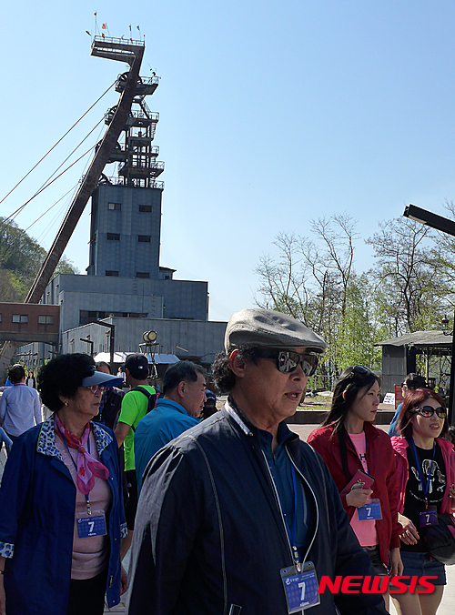 【정선=뉴시스】홍춘봉 기자 = 1일 첫 운행에 나선 이색 관광열차 'E-Tarin'을 타고 한류열풍을 일으킨 '태양의 후예' 촬영지인 강원 정선군 삼탄아트마인을 찾은 열차 관광객들이 송중기·송혜교가 열연한 드라마 촬영현장을 둘러보고 있다.2016.05.01.