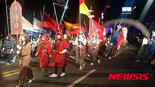 【대구=뉴시스】정창오 기자 = 7일 오후 대구 중구 국채보상로 인근에서 열린 2016 컬러풀페스티벌 예선전에서 대구 동구팀이 퍼레이드를 벌이고 있다. 2016.05.07.
