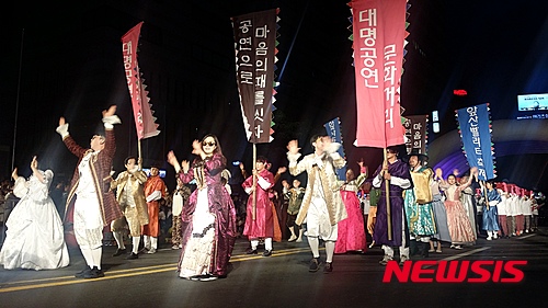 【대구=뉴시스】정창오 기자 = 7일 오후 대구 중구 국채보상로 인근에서 열린 2016 컬러풀페스티벌 예선전에서 대구 남구팀이 앞산빨래축제와 대명문화거리를 주제로 퍼레이드를 펼치고 있다. 2016.05.07.