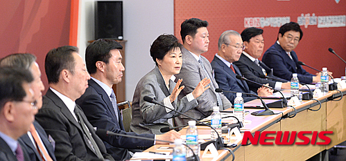 【서울=뉴시스】전진환 기자 = 박근혜 대통령이 11일 오전 서울 중구 세종대로 대한상공회의소에서 열린 경제5단체 초청 경제 외교 성과확산 토론회에 참석, 모두발언 중 '이란 방문 성과를 우리 경제의 발전 모멘텀으로 활용해야 한다'고 강조하고 있다.