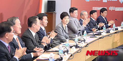 【서울=뉴시스】전진환 기자 = 박근혜 대통령이 11일 오전 서울 중구 세종대로 대한상공회의소에서 열린 경제5단체 초청 경제 외교 성과확산 토론회에 참석, 모두발언을 마치고 있다. 반원익(왼쪽부터) 한국중견기업연합회 부회장, 허창수 전국경제인연합회장, 박용만 대한상공회의소 회장, 김한기 대림산업 사장, 박근혜 대통령, 황재호 마린테크노 대표, 김인호 한국무역협회장, 박성택 중소기업중앙회장, 심기봉 덴티스 대표. 2016.05.11.