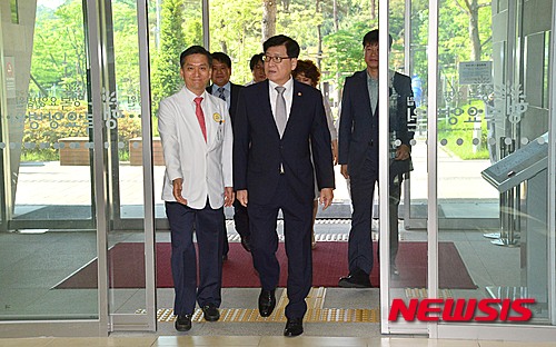 【서울=뉴시스】김선웅 기자 = 정진엽 보건복지부 장관이 병원 점검을 위해 18일 오전 서울 강남구 강남구립행복요양병원으로 들어오고 있다. 2016.05.18.