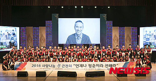 【서울=뉴시스】김진아 기자 = 지난 27일 대전 충남대학교 정심화국제문화회관에서 열린 골프존문화재단 '2016 사랑나눔 효 큰잔치'에서 골프존유원그룹 100여명의 자원봉사자들이 기념촬영을 하고 있다. 2016.05.29. (사진=골프존문화재단 제공)