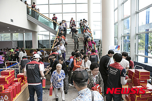 【서울=뉴시스】김진아 기자 = 지난 27일 대전 충남대학교 정심화국제문화회관에서 열린 골프존문화재단 '2016 사랑나눔 효 큰잔치'에서 골프존유원그룹 자원봉사자가 기념품을 전달하고 있다. 2016.05.29. (사진=골프존문화재단 제공)