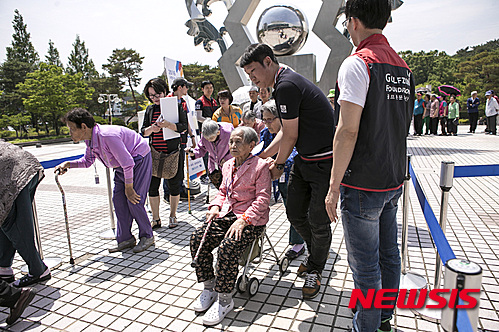 【서울=뉴시스】김진아 기자 = 지난 27일 대전 충남대학교 정심화국제문화회관에서 열린 골프존문화재단 '2016 사랑나눔 효 큰잔치'에 1700여명의 어르신들이 입장하고 있다. 2016.05.29. (사진=골프존문화재단 제공)