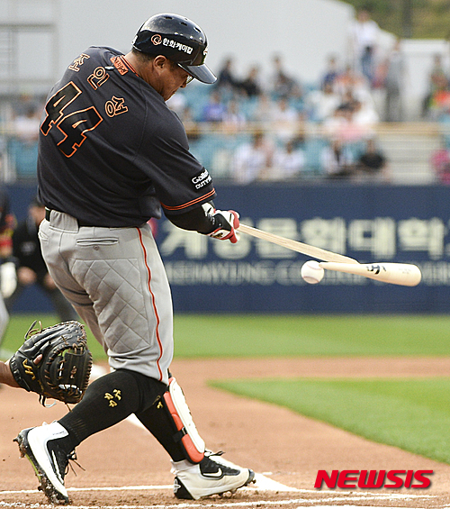 【대구=뉴시스】최진석 기자 = 3일 오후 대구 수성구 야구전설로 삼성라이온즈파크에서 열린 2016 타이어뱅크 KBO리그 한화 이글스와 삼성 라이온즈의 경기, 한화 1회초 무사 만루에 5번타자 조인성의 타격 때 배트가 부러지고 있다. 2016.06.03.
