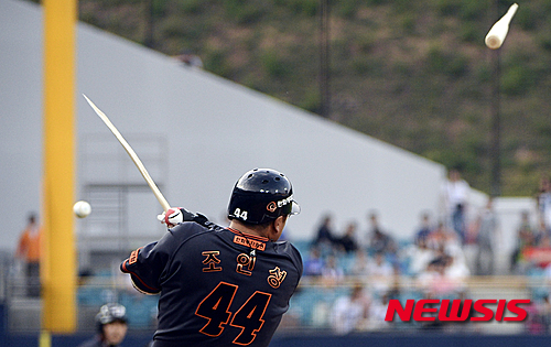 【대구=뉴시스】최진석 기자 = 3일 오후 대구 수성구 야구전설로 삼성라이온즈파크에서 열린 2016 타이어뱅크 KBO리그 한화 이글스와 삼성 라이온즈의 경기, 한화 1회초 무사 만루에 5번타자 조인성의 타격 때 배트가 부러지고 있다. 2016.06.03.