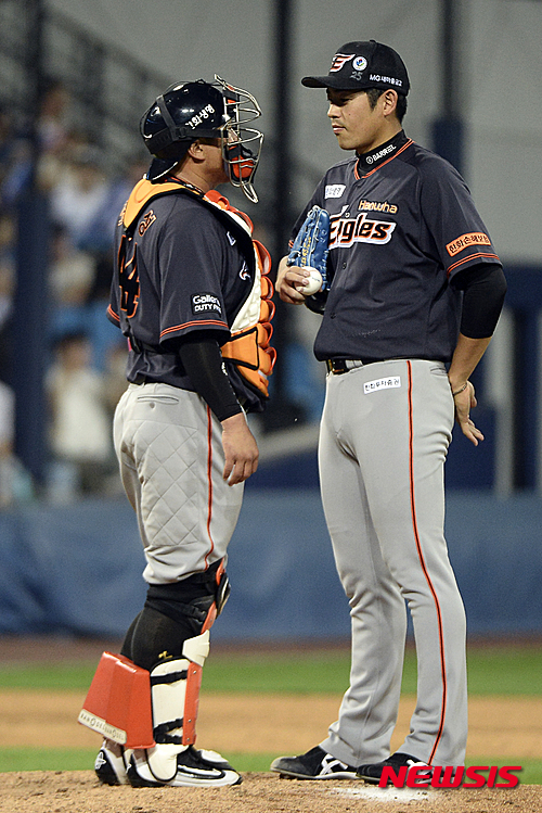 【대구=뉴시스】최진석 기자 = 3일 오후 대구 수성구 야구전설로 삼성라이온즈파크에서 열린 2016 타이어뱅크 KBO리그 한화 이글스와 삼성 라이온즈의 경기, 삼성 5회말 무사 1루에 4번타자 최형우에게 안타를 내주며 1,3루 위기에 몰리자 한화 조인성이 선발투수 이태양을 격려하고 있다. 2016.06.03.