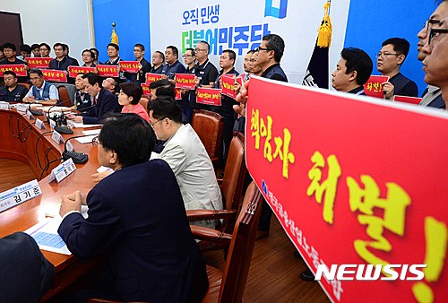 【서울=뉴시스】전신 기자 = 더불어민주당 우상호 원내대표와 한정애 진상조사단장이 8일 서울 여의도 국회에서 김문호 금융노조 위원장 등이 배석한 가운데 성과연봉제 진상조사단 브리핑을 하고 있다. 2016.06.08