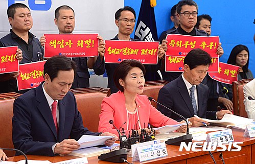 【서울=뉴시스】전신 기자 = 더불어민주당 우상호 원내대표와 한정애 진상조사단장이 8일 서울 여의도 국회에서 김문호 금융노조 위원장 등이 배석한 가운데 성과연봉제 진상조사단 브리핑을 하고 있다. 2016.06.08