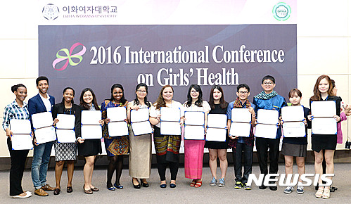 【서울=뉴시스】 박문호 기자 = 8일 오전 서울 서대문구 이화여자대학교 LG 컨벤션홀에서 열린 개발도상국 소녀건강 증진과 해결책 모색을 위한 '세계 소녀건강 학생경연대회 및 국제학술대회' 수상자들이 포즈를 취하고 있다.
