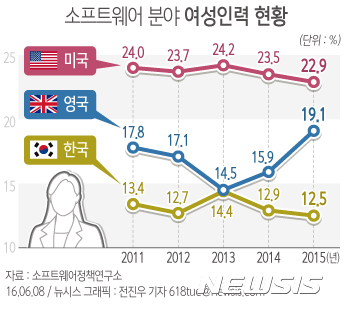 【서울=뉴시스】전진우 기자 = 소프트웨어정책연구소는 8일 'SW여성인력 현황 비교분석' 보고서에 따르면 지난 2015년 국내 소프트웨어(SW) 분야 여성인력 비중은 12.5%이다. 미국 등 SW선진국 대비 60% 수준에 불과하다.