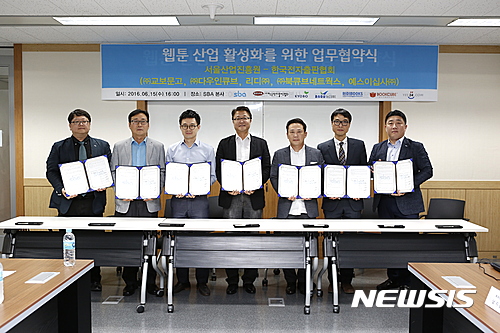 【서울=뉴시스】15일 오후 서울 마포구 상암동 서울산업진흥원 본사에서 열린 제1회 SBA 웹툰파트너스 데이 행사에서 서울산업진흥원과 한국전자출판협회 관계자들이 웹툰 산업 활성화를 위한 업무협약(MOU)를 체결하고, 기념사진을 촬영하고 있다.