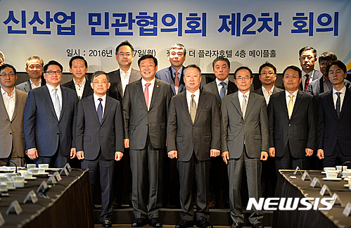 【서울=뉴시스】박진희 기자 = 심각한 세계경제상황에서 27일 오전 서울 중구 프라자호텔에서 열린 신산업 민관협의회 회의에 참석한 주형환 산업통상자원부 장관이 심각한 표정의 기업인들과 대조적으로 웃으며 기념 사진을 찍고 있다. 2016.06.27.