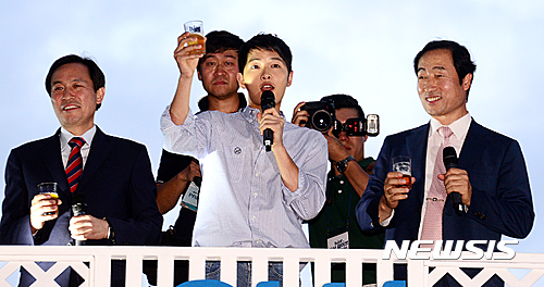 【서울=뉴시스】추상철 기자 = 제2회 신촌맥주축제 일환으로 '하이트 원샷 웨이브 페스티벌' 행사가 열린 14일 오후 서울 서대문구 신촌 연세로에서 하이트 모델 송중기가 더불어 민주당 우상호 원내대표와 문석진 서대문구청장과 함께 건배제의를 하고 있다. 2016.07.14.