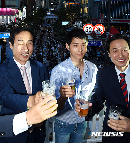 【서울=뉴시스】추상철 기자 = 제2회 신촌맥주축제 일환으로 '하이트 원샷 웨이브 페스티벌' 행사가 열린 14일 오후 서울 서대문구 신촌 연세로에서 하이트 모델 송중기가 더불어 민주당 우상호(오른쪽) 원내대표와 문석진 서대문구청장과 함께 건배제의를 하고 있다. 2016.07.14.