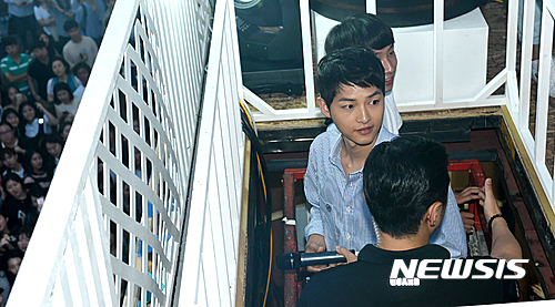 【서울=뉴시스】추상철 기자 = 제2회 신촌맥주축제 일환으로 '하이트 원샷 웨이브 페스티벌' 행사가 열린 14일 오후 서울 서대문구 신촌 연세로에서 하이트 모델 송중기가 리프트를 타고 단상으로 오르고 있다. 2016.07.14.