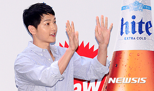 【서울=뉴시스】추상철 기자 = 제2회 신촌맥주축제 일환으로 '하이트 원샷 웨이브 페스티벌' 행사가 열린 14일 오후 서울 서대문구 신촌 연세로에서 하이트 모델 송중기가 팬을 향해 손을 흔들고 있다. 2016.07.14.