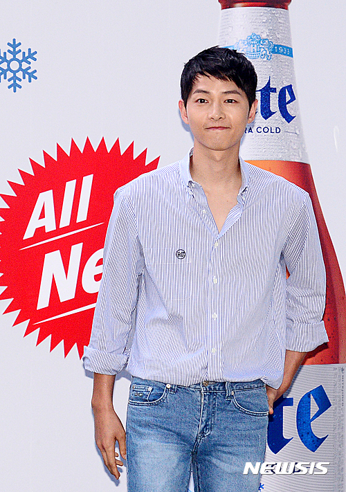 【서울=뉴시스】추상철 기자 = 제2회 신촌맥주축제 일환으로 '하이트 원샷 웨이브 페스티벌' 행사가 열린 14일 오후 서울 서대문구 신촌 연세로에서 하이트 모델 송중기가 포즈를 취하고 있다. 2016.07.14.