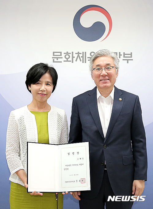 【서울=뉴시스】김종덕 문화체육관광부 장관이 22일 서울 용산구 국립극단 회의실에서 송혜진 국악방송 신임 사장에게 임명장을 수여하고 있다. 2016.07.22. (사진=문화체육관광부 제공)