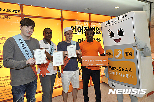 【서울=뉴시스】10일 인천공항 밀레니엄홀에서 열린 '제7회 인천공항 bbb-day 캠페인'에 참석한 bbb 특임홍보대사인 외국인 유튜브 스타인 데이브, 제씨, 콩고 왕자 라비가 기념촬영을 하고 있다. 2016.08.10. (사진=bbb코리아 제공)