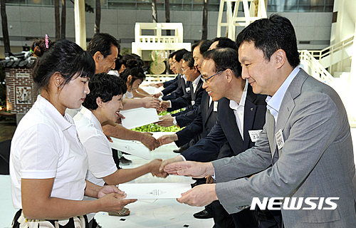 【서울=뉴시스】10일 인천공항 밀레니엄홀에서 열린 '제7회 인천공항 bbb-day 캠페인'에 참석한 정일영 인천공항공사 사장, 유장희 bbb 코리아 회장과 인천공항 취항 항공사 사장단이 제3기 bbb 인천공항 특임 봉사단에 위촉장을 수여하고 있다. 2016.08.10. (사진=bbb코리아 제공)