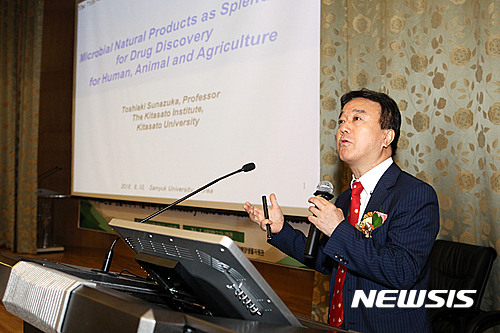 【서울=뉴시스】10일 서울 노원구 삼육대학교 요한관 홍명기홀에서 열린 제71회 한국생물과학협회 정기학술대회에서 지난해 일본에서 생물산업으로 노벨상을 수상한 토시아키 수나주카 박사가 기조연설을 하고 있다. 2016.08.10. (사진=삼육대학교 제공)
