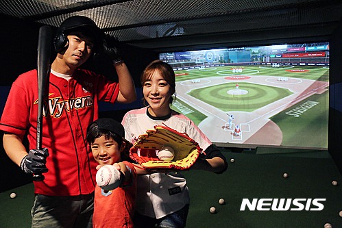 【서울=뉴시스】권현구 기자 = 15일 오전 경기 용인시 이마트 죽전점 일렉트로마트에서 모델들이 스크린 야구 코너를 선보이고 있다. 2016.08.15. (사진=이마트 제공)