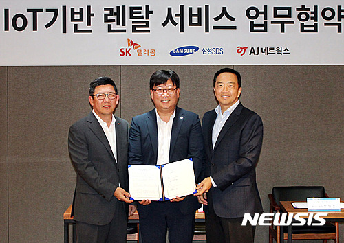 【서울=뉴시스】SK텔레콤(대표이사 사장 장동현)과 AJ네트웍스(대표이사 사장 반채운), 삼성SDS(대표이사 사장 정유성)는 24일 서울 송파구 문정동 AJ네트웍스 본사에서 IoT의 렌탈상품 접목을 위한 양해각서를 체결했다.