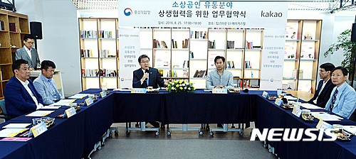 이 협약은 소수 유통채널에 의한 유통시장 독과점으로 판로 확보가 어려운 소상공인과 중소기업을 위해 카카오의 주문생산플랫폼 '메이커스 위드 카카오' 입점을 지원하고 위치기반 기술을 활용한 고객 유치, 온라인 투자 교육, 정책정보 등을 제공한다. 이 자리에는 주영섭 중소기업청장, 임지훈 카카오 대표, 최승재 소상공인엽합회 회장 등이 참석했다. 2016.08.25.