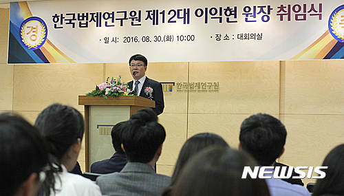 【서울=뉴시스】30일 세종시 한국법제연구원에서 열린 '제12대 이익현 원장 취임식'에 참석한 이익현 원장이 취임사를 하고 있다. 2016.08.30. (사진=한국법제연구원 제공)