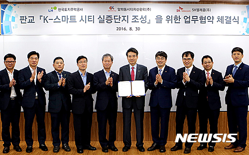 【서울=뉴시스】SK텔레콤은 30일 경기도 성남시 분당구 판교에 건설중인 알파돔시티에 LH, 알파돔시티자산관리와 함께 IoT 및 AR, 빅데이터 기술을 활용한 미래형 도시 ‘K-스마트시티’를 구축하기 위한 협약을 체결했다고 밝혔다.