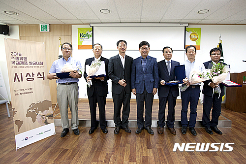 【서울=뉴시스】이영환 기자 = 5일 서울 강서구 한국임업진흥원에서 열린 2016 수출유망 목재제품 발굴대회 시상식에서 김남균(왼쪽 네 번째) 한국임업진흥원장과 수상자들이 기념촬영 하고 있다. 2016.09.05. (사진=한국임업진흥원 제공)