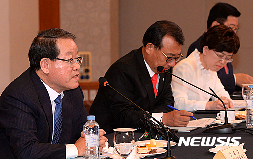 【서울=뉴시스】박주성 기자 = 강호갑 중견기업연합회 회장이 5일 오후 서울 마포구 서울가든호텔 2층 그랜드 볼룸에서 열린 '새누리당 대표 초청 중견기업계 간담회'에서 인사말을 하고 있다. 2016.09.05.