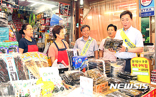 【서울=뉴시스】추석을 앞둔 6일 이창우 동작구청장이 서울 동작구 사당동 남성 사계전통시장을 찾아 제수용품을 구입하고 있다. 2016.09.06. (사진=동작구 제공)
