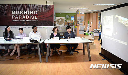 【서울=뉴시스】방지원 인턴기자 = 7일 오전 서울 종로구 환경운동연합 열린공간에서 '한국계 기업의 열대우림 파괴와 그 진실'을 주제로 열린 기자회견에서 관계자들이 자연 파괴 영상을 시청하고 있다.
