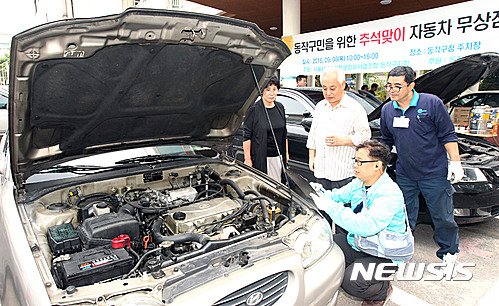 【서울=뉴시스】민족의 최대명절인 추석을 일주일 앞둔 8일 서울시 동작구 동작구청 주차장에서 서울시자동차전문정비사업조합 동작구지부주관으로 고향가는 구민을 위한 추석맞이 자동차 무상검검을 하고 있다. 2016.09.08. (사진=동작구 제공)