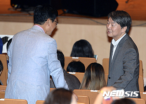 【고양=뉴시스】최진석 기자 = 안철수 전 국민의당 상임공동대표가 18일 오후 경기 고양시 고양아람누리 아람음악당에서 열린 DMZ 국제다큐영화제 '다큐&뮤직콘서트'에 참석해 관계자와 대화를 나누고 있다. 2016.09.18.
