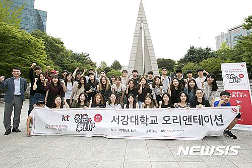 전국 대학생이면 누구나 참여할 수 있으며, 신청서 접수는 20일부터 10월 10일까지 이메일([email protected])로 가능하다. 시상은 11월 예정으로 입상작에는 대상 200만원, 최우수상 100만원(2팀), 우수상 50만원(2팀) 등 상금과 표창이 수여된다. 사진은 9월초 서강대학교 커뮤니케이션학부 대상으로 ‘KT청춘기업 2학기 오리엔테이션’ 시행 후 기념 촬영하는 모습. 2016.09.19. (사진=KT 제공)