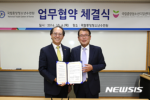【천안=뉴시스】이종익 기자 = 국립중앙청소년수련원 박철웅 원장(왼쪽)과 국립중앙청소년디딤센터 박영균 원장은 6일 오후 충남 천안의 국립중앙청소년수련원에서 청소년들의 안전하고 건강한 삶 향상을 위한 업무협약 체결 후 기념사진 촬영을 하고 있다. 2016.10.6. (사진=국립중앙청소년수련원 제공)