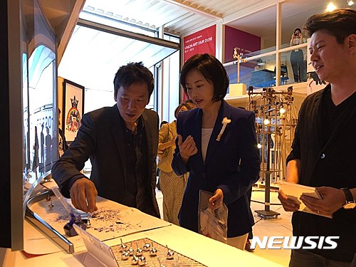 【서울=뉴시스】 조윤선 문화체육관광부 장관이 8일 서울 용산구 한남동 인터파크 네모에서 열린 2016 작가미술장터, 유니온 아트페어 현장을 방문해 작가로부터 작품 설명을 듣고 있다. 2016.10.09.(사진=예술경영지원센터 제공)
