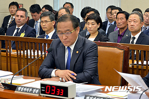 【서울=뉴시스】박진희 기자 = 12일 오후 서울 여의도 국회에서 열린 2016 안전행정위원회 행정자치부 국정감사에 출석한 토니 헤이워드(장관 뒷줄 왼쪽부터) BAT코리아 대표, 김흥렬 KT&G 부사장, 강유선 JTI코리아 대외홍보이사, 정일우 한국필립모리스 대표가 증인석에서 국정감사를 지켜보고 있다. 2016.10.12.