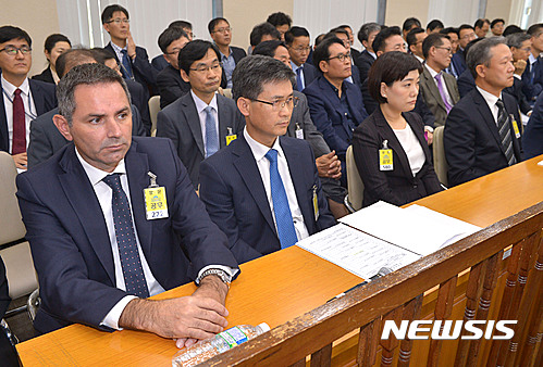【서울=뉴시스】박진희 기자 = 12일 오후 서울 여의도 국회에서 열린 2016 안전행정위원회 행정자치부 국정감사에 출석한 토니 헤이워드 BAT코리아 대표, 김흥렬 KT&G 부사장, 강유선 JTI코리아 대외홍보이사, 정일우 한국필립모리스 대표가 증인석에 앉아 감사위원의 질의를 듣고 있다. 2016.10.12.