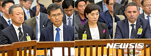 【서울=뉴시스】박진희 기자 = 12일 오후 서울 여의도 국회에서 열린 2016 안전행정위원회 행정자치부 국정감사에 출석한 정일우(왼쪽부터) 한국필립모리스 대표, 김흥렬 KT&G 부사장, 강유선 JTI코리아 대외홍보이사, 토니 헤이워드 BAT코리아 대표가 국감을 증인으로 출석하여 의원들의 질의를 듣고 있다. 2016.10.12.