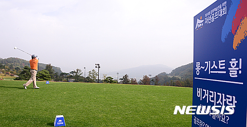 【안성=뉴시스】추상철 기자 = 골프존문화재단의 '제10회 문화예술인을 위한 자선골프대회'가 열린 17일 오전 경기도 안성 골프존카운티 안성Q에서 참가자가 이벤트 홀에서 티샷을 하고 있다.