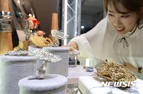 【서울=뉴시스】이영환 기자 = 18일 오후 서울 중구 동대문디자인플라자(DDP) 살림터에서 2016 패션위크의 일환으로 개최된 '2016 서울주얼리위크'에서 관계자들이 놀이터(NORITER) 제품을 살펴보고 있다