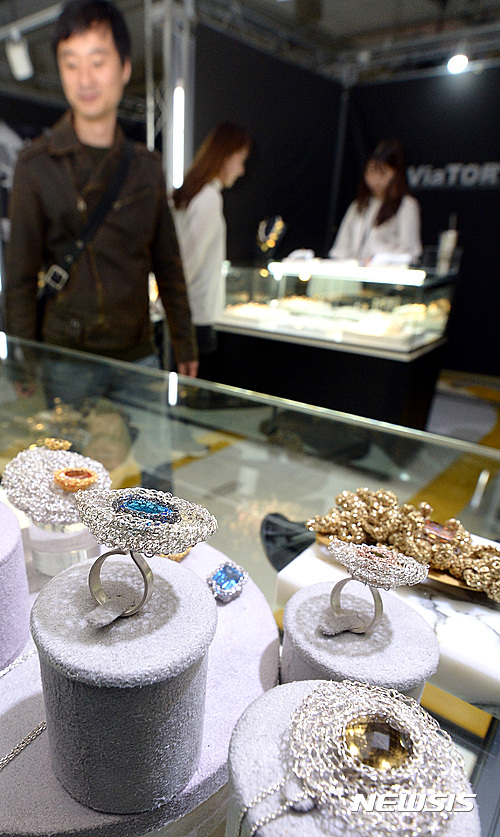 【서울=뉴시스】이영환 기자 = 18일 오후 서울 중구 동대문디자인플라자(DDP) 살림터에서 2016 패션위크의 일환으로 개최된 '2016 서울주얼리위크'에서 한 관계자들이 참가 업체의 제품을 살펴보고 있다