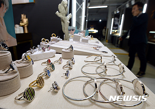 【서울=뉴시스】이영환 기자 = 18일 오후 서울 중구 동대문디자인플라자(DDP) 살림터에서 2016 패션위크의 일환으로 개최된 '2016 서울주얼리위크'에서 한 관계자가 레인디어(Reindeer) 제품을 살펴보고 있다