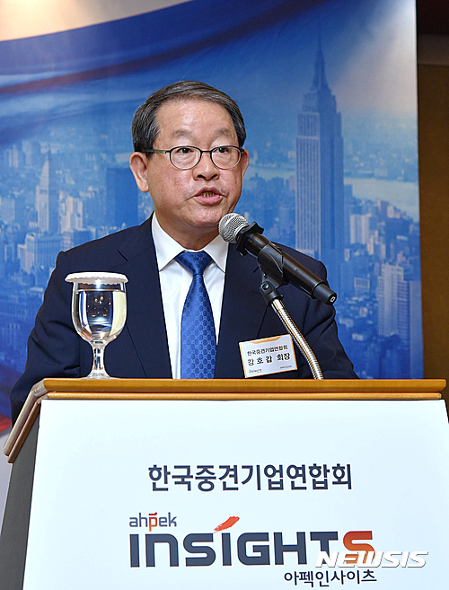 【서울=뉴시스】19일 오전 서울 소공동 롯데호텔에서 열린 한국중견기업연합회 제165회 아펙인사이츠 조찬강연회에 참석한 강호갑 중견련 회장이 환영사를 하고 있다. 2016.10.19. (사진=한국중견기업연합회 제공)