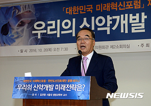 【서울=뉴시스】박주성 기자 = 박재완 한반도선진화재단 이사장이 20일 오전 서울 여의도 국회 의원회관에서 열린 대한민국 미래혁신포럼 제3차 정례세미나 "우리의 신약개발, 미래전략은?"에서 축사를 하고 있다. 2016.10.20.